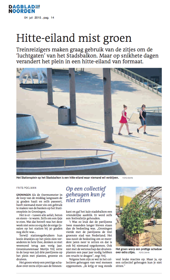 In Groningen stonden er, voor een seizoen drie. Het 1 uur Festival was een groot succes. Theater, boeklezing en muziek in het groen, het publiek draaide mee en ging bij de drie artiesten op bezoek. De paviljoens werden gezien als welkome groene oases in de stad, het Stadsbalkon is opgetrokken uit asfalt. De Groenpaviljoens zochten voor verkoeling door hun groen en schaduw. Groen verpozen in de stad. De Groenpaviljoens zijn een antwoord op hittestress in steden.