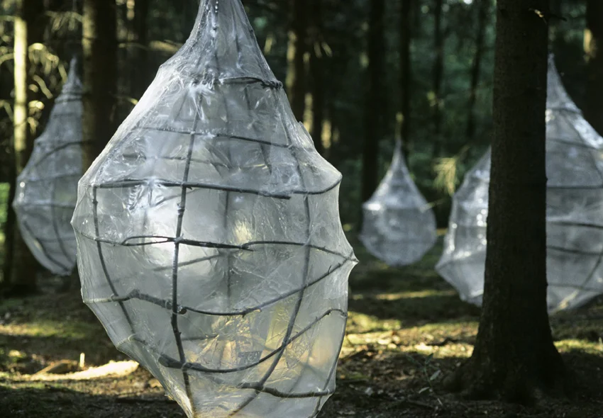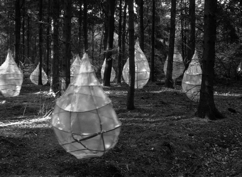 Voor AINN / Natuurkunst Drenthe in Schoonoord, internationaal Art-In-Nature symposium met als thema het verstilde water van de kanalen in Drenthe. In dennenbos van Staatsbosbeheer, welke middels werkvoorziening projecten begin 20ste eeuw is aangeplant, druppels gehangen. Kenmerkend en helder beeld voor 'Still Water'. Het 'gefundene fressen' van dit werk was het feit dat bij het bewegen van de bomen de druppels gingen dansen tussen de bomen ...